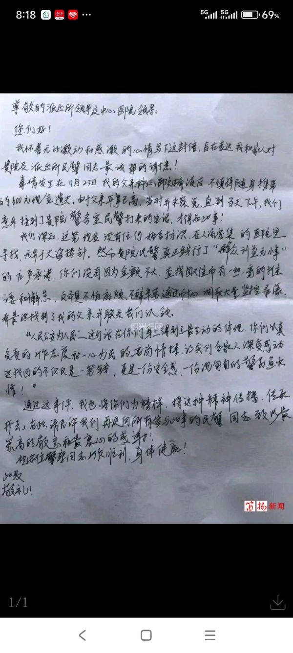 事情并未就此结束。几天后,老人的孩子专程来到警务室,将一封工工整整、写满600来字的感谢信交到沈国钞手中。信纸朴素,字迹恳切,一笔一画皆透着由衷的感激。纸短情长,这封信承载的,不只是陌生人的拾金不昧、警务人员的不懈追寻、“救命钱”的流转接力,更是人心之间最珍贵的信任与温度。这串始于街角的善意环环相扣,最终化作有形的文字与无尽的心意,持续温暖、鼓舞着每一个听闻这个故事的人。