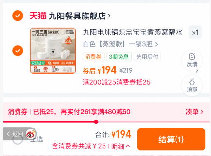 现在淘宝买东西建议避开活动期,昨天晚上想买这个炖锅,价格是153元,看到下方有4号活动开始的提示,满200减25,想着今天买,凑单还能再便宜些,结果今天上午打开一看,价格变成了194元!再一次被淘宝背刺!