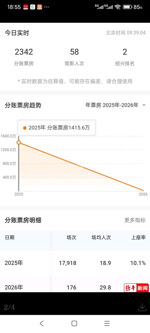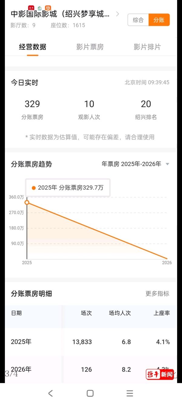 记者对比查看了灯塔专业版2025年度绍兴多家影院分账票房、场均人次及上座率。在绍兴排名靠前的某家影院,2025年度分账票房为1415.6万,场均人次为19.2,上座率为10.2%。而像绍兴梦享城影院这样排名较靠后的院线,2025年度分账票房为329.7万,场均人次仅6.8,上座率4.1%。从2025年下半年单日数据来看,该院线单日分账票房205元,场均人次最低为0.2,上座率仅0.1%(11月3日)。
