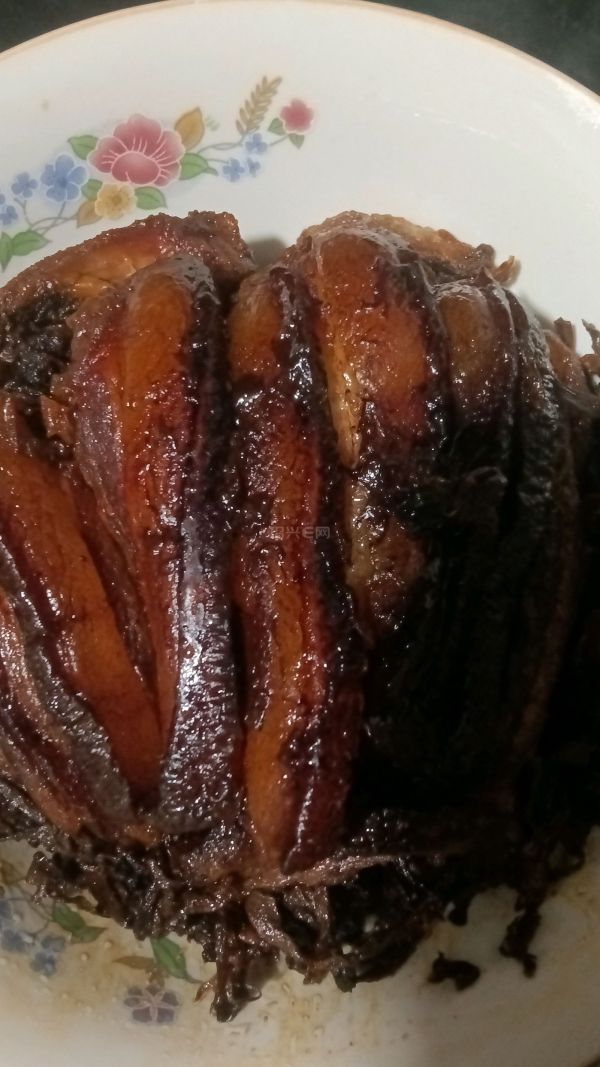 选一块肥瘦相间的猪肉,先煮熟后炸脆,在放炒过的霉干菜,上锅蒸,小火慢蒸3个小时,出锅后再倒扣,完美的扣肉出锅了。