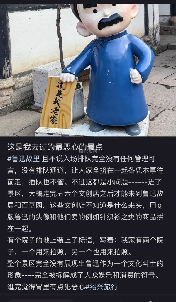 主要是排队时间太长,心生怨气,结果看什么都不顺眼。鲁迅故里要做大做强,二期和一期之间应当再建一座桥,做到无缝连接,方便从一期到二期的游客。三期也应该上马了,只有做大,才能减少排队时间,提高游客满意度。