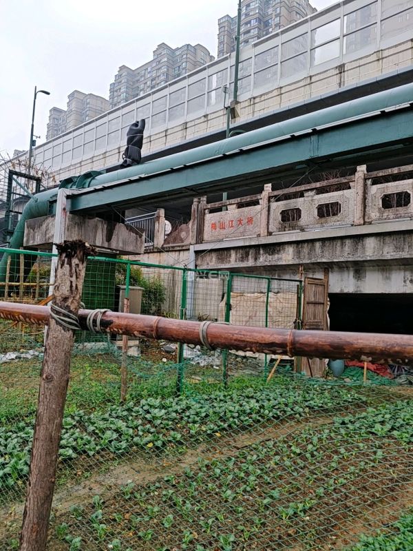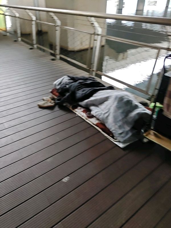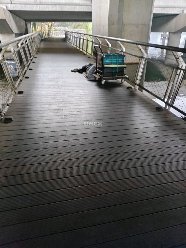 梅山江大桥东坡桥下步道上睡着一个人