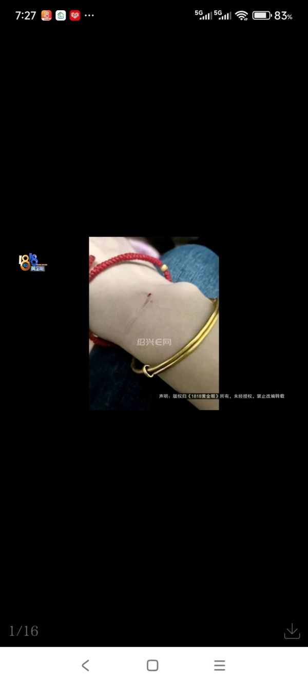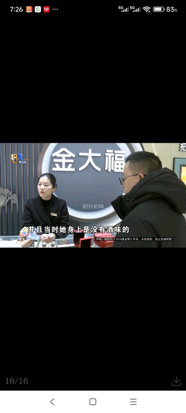 绍兴越城区滨河商业中心金大福 店长:我们的销售跟顾客的对话是一问一答、一来一往的,并且当时她身上是没有酒味的,也没有说她喝酒,走路姿势都是正常的。需要监控的话,我这边4号、5号我去办公室打报告去申请,到时候公司这边给一个什么处理方式,我们会跟顾客沟通。