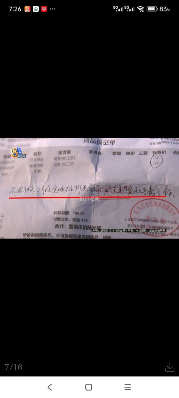 绍兴越城区滨河商业中心金大福 店长:这个一般客户要我们会给到,如果没有要,我们这边也要统一回收回来的。但是我们质保单上面,它的品名、价格、什么时候售出都是有的。