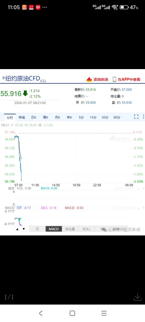 1月7日,国际油价大幅走低,纽约原油跌2.12%,报55.916美元/桶;布伦特原油主力合约跌2.06%,报60.49美元/桶。