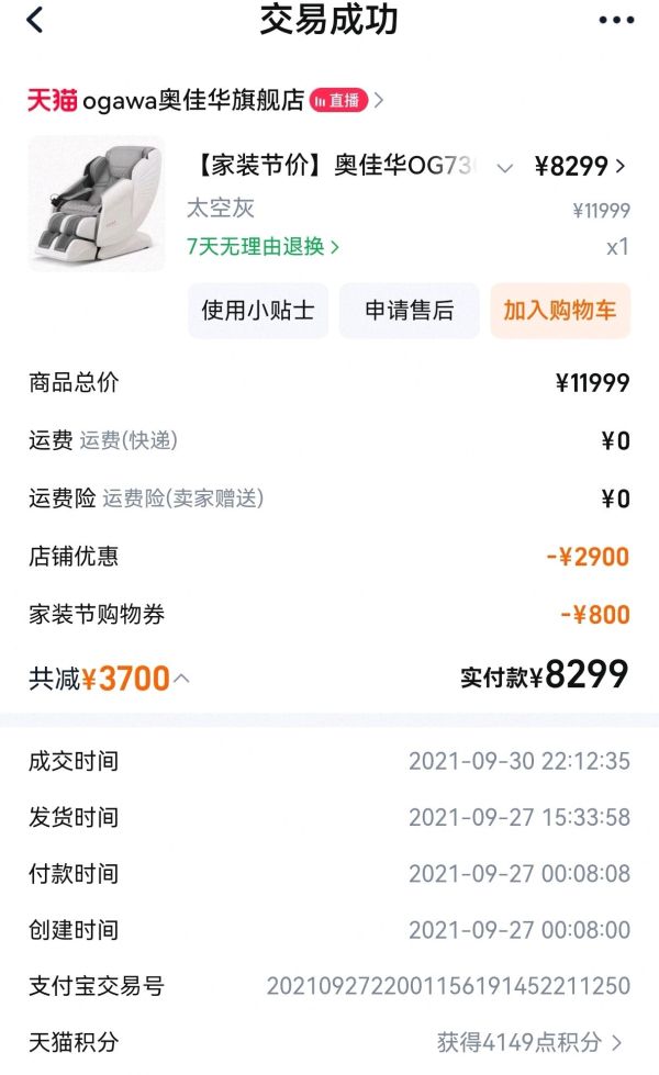 四年前花8000多买了个奥佳华按摩椅。