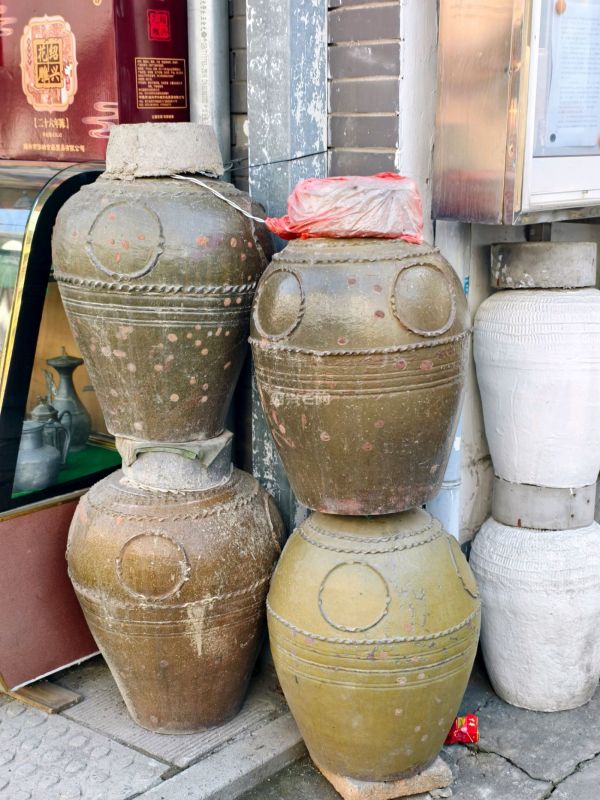 绍兴黄酒小镇看见几个老酒坛,查了资料,这组酒坛为清末至民国时期的陶坛。这类陶坛延续了清代诸暨陶坛的烧制工艺,坛身的圆形纹饰、绳纹装饰也是这一时期绍兴黄酒坛的典型特征,同时是民国时期绍兴酒坊储存黄酒的主流器具。