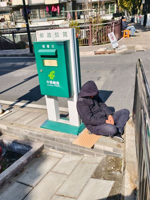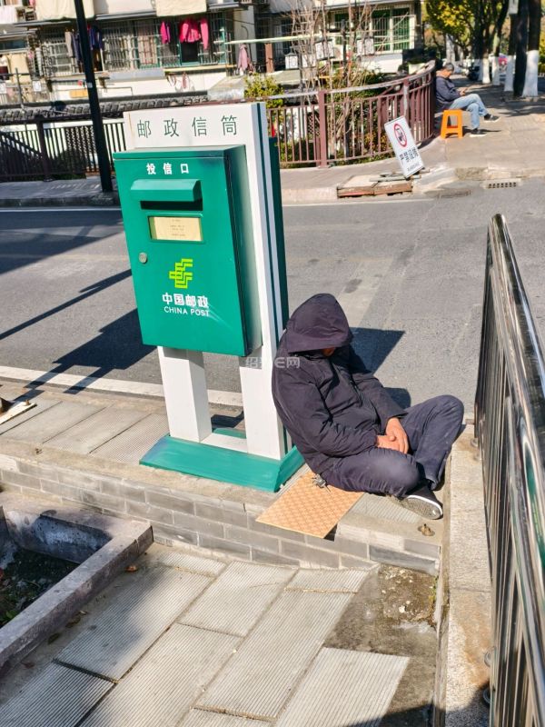 白马路口邮政相下面有人背靠这里晒太阳睡着了,哈哈,真会挑地方