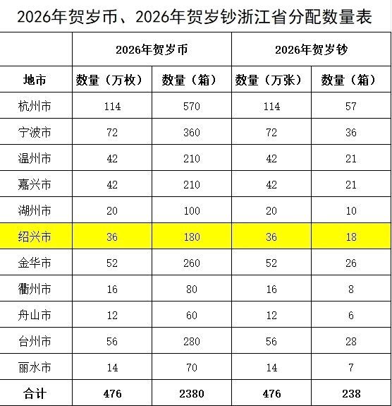 此次浙江省共分配到476万枚纪念币、476万张纪念钞,其中绍兴市分配到36万枚纪念币、36万张纪念钞。