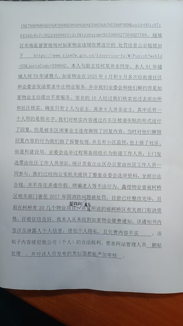 帖子处理申请书,只说“未收到催缴单”“欠费内容不实”,全文没有正面澄清“我没欠缴物业费”或“我已缴清物业费”。
