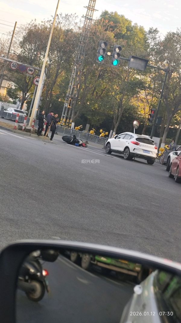 于越快速路与越英路路口白色小车和电瓶车发生车祸,堵了一大堆,小车只能走非机动车道,公交车司机:我怎么开