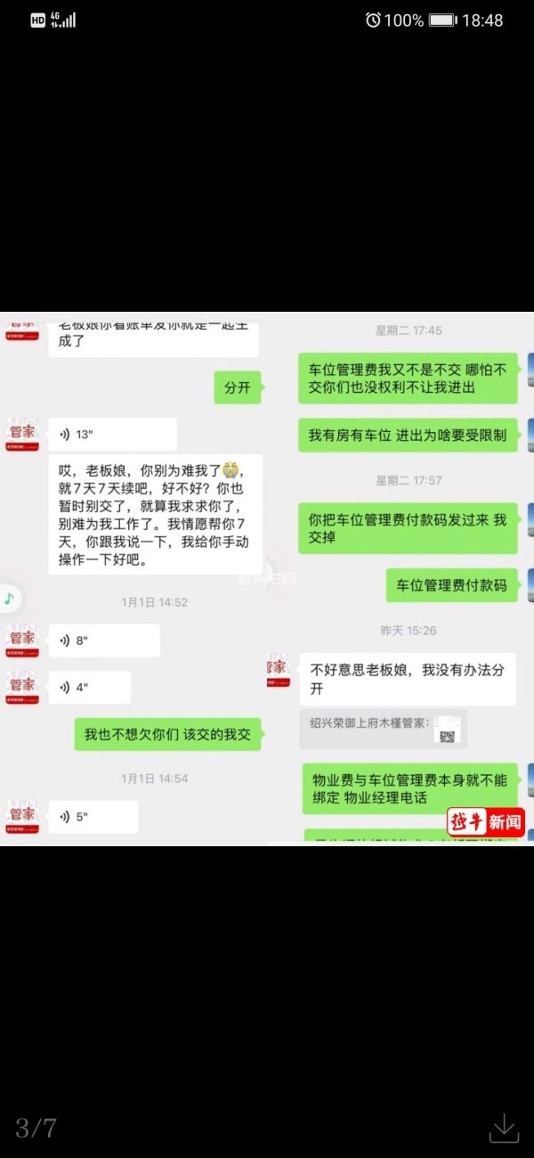 更让她不满的是后续沟通的过程。她多次向物业管家索要单独缴纳车位管理费的支付码,均被拒绝。对方表示“车位管理费需与物业费一起交,不能分开支付”。此前,管家曾承诺可为其手动开闸七天,之后又称“没有权限”。