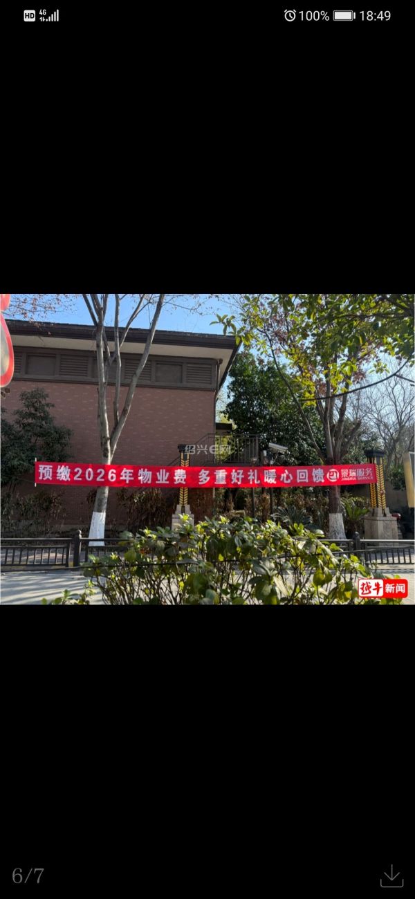在小区内,记者看到悬挂着“提前缴纳物业费,好礼相赠”的横幅,物业在催费方面显然已多方尝试。