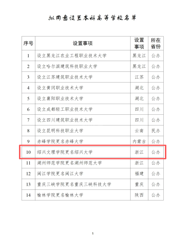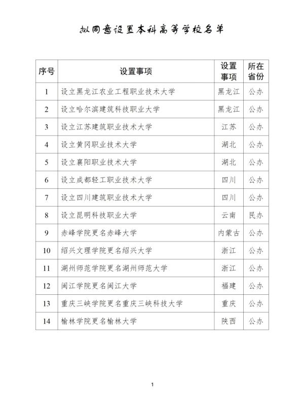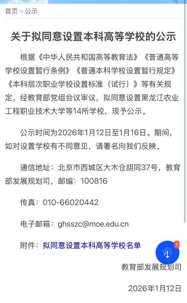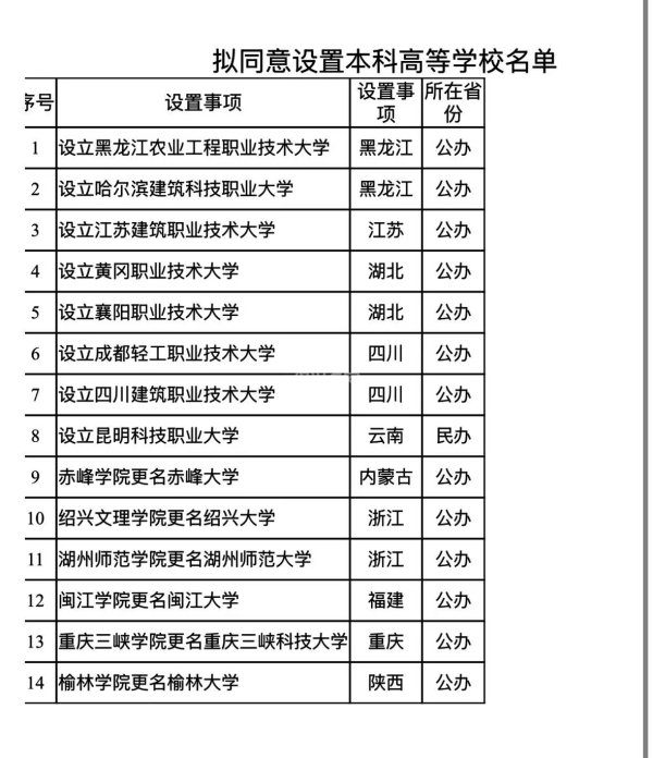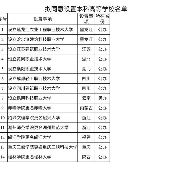 1月12日,教育部公布关于拟同意设置本科高等学校的公示。根据《中华人民共和国高等教育法》《普通高等学校设置暂行条例》《普通本科学校设置暂行规定》《本科层次职业学校设置标准(试行)》等有关规定,经教育部党组会议审议,拟同意设置黑龙江农业工程职业技术大学等14所学校,现予公示。