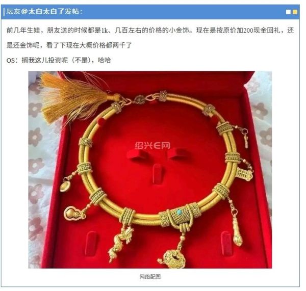 “几年前生娃朋友送了千元金饰,现在要回礼金价翻了倍,实在犯难!”近日,绍兴本地论坛上一则关于黄金回礼的帖子,引发了众多网友的热议与共鸣。