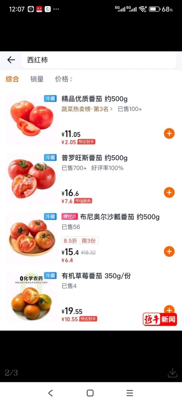 在线上买菜平台,西红柿的价格则更高一些。不考虑优惠券的话,每斤售价都在10元以上,个别包装好的精品西红柿售价达19.55元/斤。