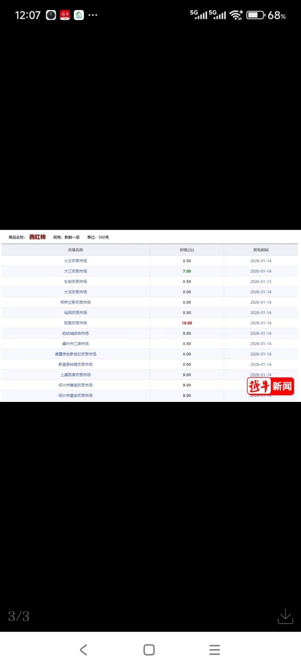 越牛新闻记者查询官网发现,1月14日当天,绍兴各地农贸市场的西红柿价格,每斤7~10元不等。