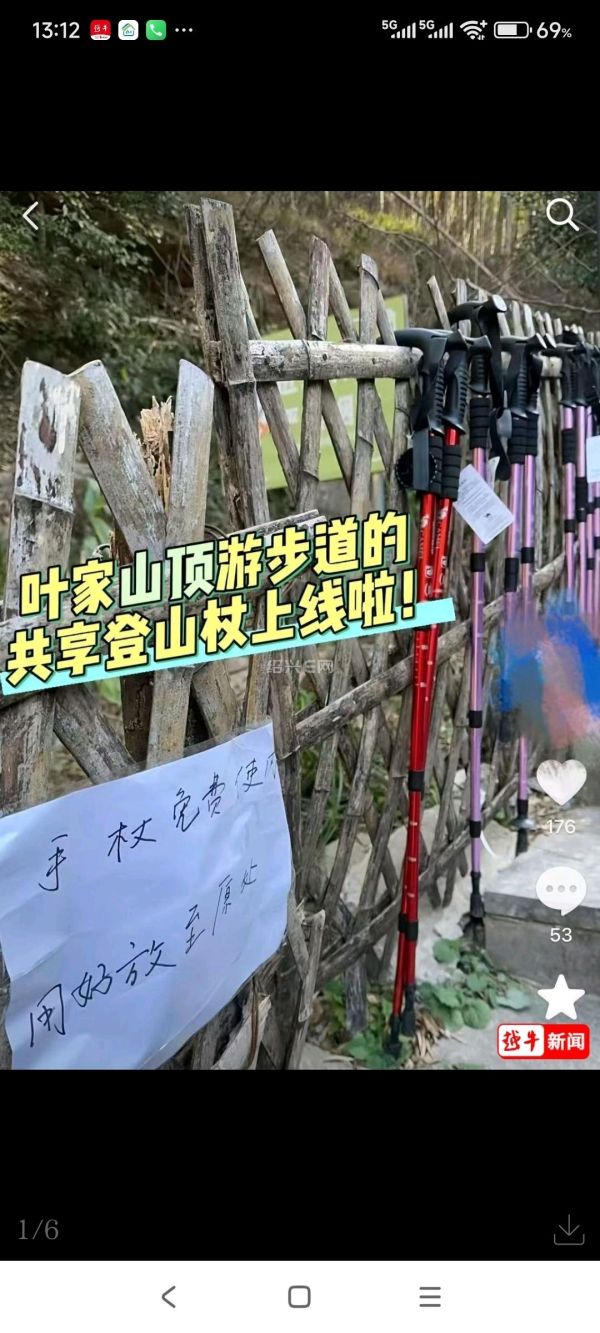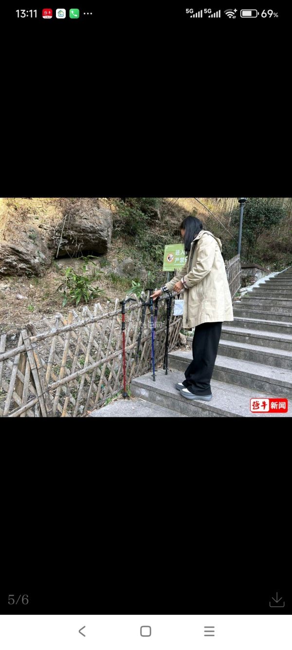 叶家山顶游步道全程共1046级台阶,因沿途风景秀丽,成为颇具人气的“网红步道”。“有人放置共享登山杖”的消息在社交平台传开后,引来不少市民与登山杖打卡合影,分享这份来自陌生人的温暖。