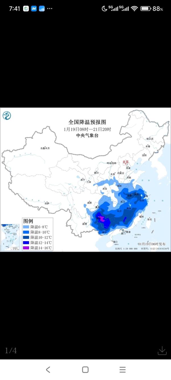预计,1月19日08时至1月21日08时,黄淮中南部、江汉大部、江淮、江南大部、西南地区东部、华南大部等地气温下降6~10℃,其中,陕西中部、山西南部、河南中东部、安徽、江苏大部、上海、浙江、湖北大部、湖南、江西、福建西部和北部、广东北部、广西、重庆、贵州等地部分地区降温可达10~14℃,局地降温可达16℃以上。