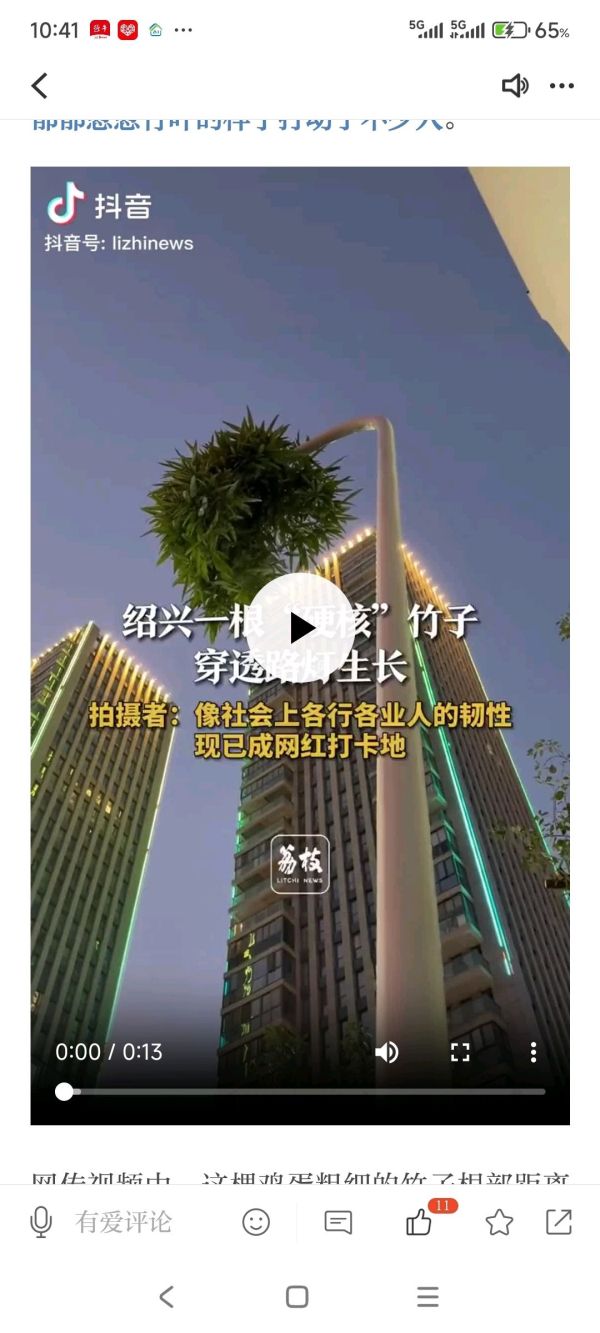 几天来,浙江绍兴新昌县一棵竹子吸引了当地不少人打卡拍照,被大家称为“竹坚强”,因为它穿过数米路灯杆最终依然探出郁郁葱葱竹叶的样子打动了不少人。