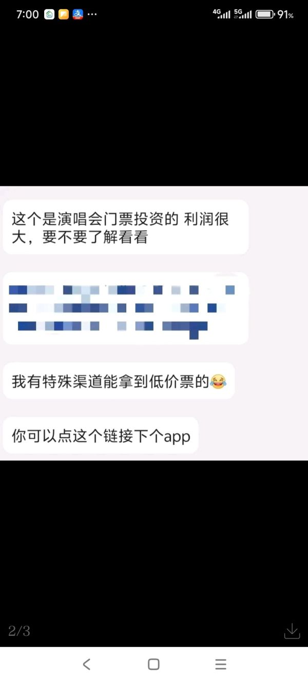 聊天过程中,“小铭爸爸”向阿芳透露,他正在从事一项“演唱会门票投资”业务,可以通过特殊渠道低价购入热门演唱会门票,待票价上涨后再高价卖出,赚取差价。