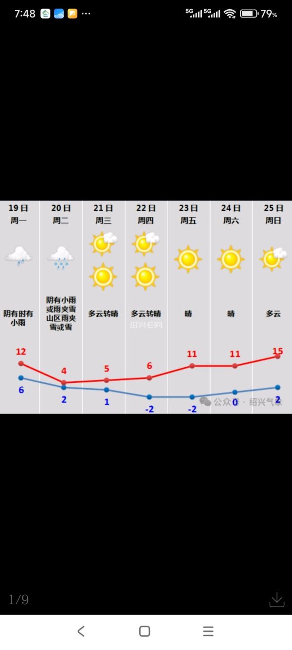 绍兴市气象台2026年1月21日6:00发布的低温报告:受寒潮影响,预计明后天早晨最低气温平原地区-1~-3℃,有冰冻,山区-4~-6℃,有严重冰冻,请注意加强防范。短期天气预报:今天阴到多云,明天晴到多云。东北风3~4级阵风5~7级。今天最高气温:3~5℃,比昨天偏高2℃左右。明天最低气温:-1~-3℃,有冰冻,山区-4~-6℃,有严重冰冻,比今天偏低2℃左右。后天晴到多云 -2~10℃。