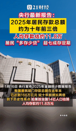 1月16日,央行发布2025年金融统计数据报告。我国居民部门存款总额在去年末已达到166万亿元,较十年前增长两倍,创下历史性高点。如果按全国14亿人口估算,人均存款约11.8万元。