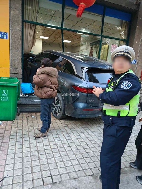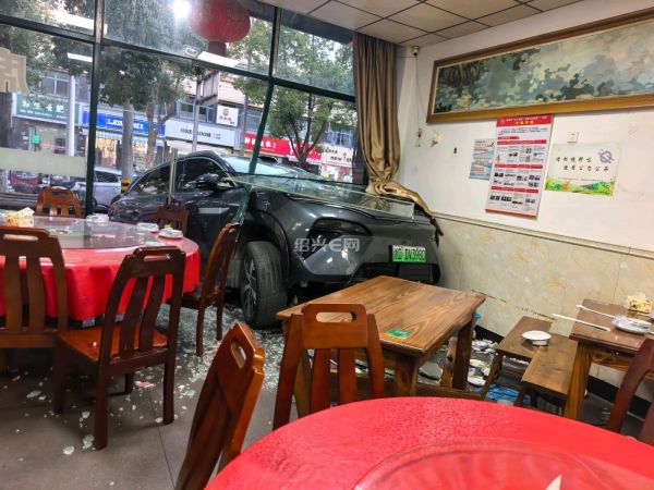 好家伙,肚子有那么饿吗?急得连车带人撞进店里了。