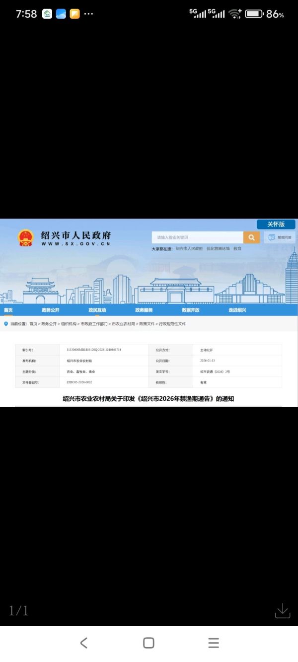 为加强我市八大流域禁渔期管理,推进水生生物资源养护和生态环境保护,严厉打击禁渔期违法捕捞活动,促进我市渔业可持续发展,根据浙江省农业农村厅《关于实行钱塘江、瓯江、椒江、甬江、苕溪、运河、飞云江、鳌江等八大流域禁渔期制度的通告》(ZJSP65-2022-0003)、原浙江省海洋与渔业局《关于绍兴市实施外荡禁渔期的批复》(浙海渔法〔2001〕98号)和《关于上虞市等三市、县要求实施禁渔制度的批复》(浙海渔政〔2007〕29号)等有关规定,特制定《绍兴市2026年禁渔期通告》,现予印发,请认真贯彻执行。