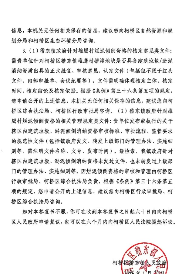 值得注意的是,稽东镇政府在答复书中明确表示“无任何相关保存的信息”,并将咨询指向区级部门。这种“甩锅式”回应,反映出基层在生态环境治理上的被动与缺位。根据《浙江省生态环境保护工作职责规定》,乡镇政府负有属地管理责任,应加强对辖区内固体废物堆放、处置行为的日常巡查与制止。此次事件中,长达数月的倾倒行为未被及时发现,暴露出监管机制的严重失效。