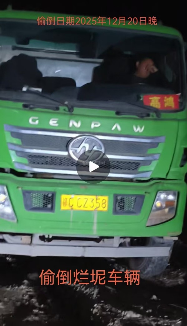 根据现场影像资料,自2025年8月14日起,大量烂泥被倾倒在雄鹰村湾塘地块,至12月仍持续堆积,覆盖山体坡地,形成大面积裸露泥堆,与周边绿植形成强烈反差。12月20日晚,一辆车牌号为“浙C·CZ358”的绿色自卸卡车被拍到正在现场倾倒,车头标有“GENPAW”字样,驾驶室内可见驾驶员。该车疑似为红岩品牌自卸车,属工程运输常见车型。
