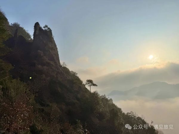 是时,云雾笼罩着山谷,冬日的阳光透出云层,照在嶙峋的石峰、傲骄张扬的独松上,勾勒出的剪影,在云海与蓝天的背景里,显得如此的瑰奇。