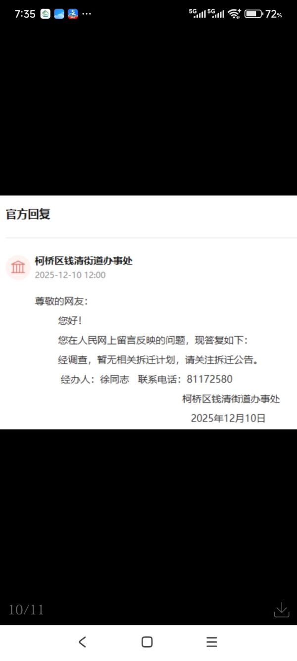 问:想请问一下钱清街道珠墅村最近几年还会拆迁吗,还是说以后都不拆了。