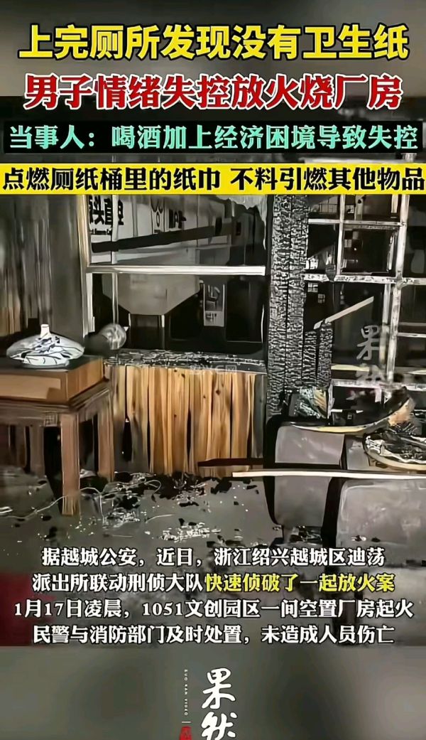 绍兴一男子喝醉酒回家,路过一家厂房,借用人家厕所,谁知上完发现没有厕纸,心中郁闷,又加之最近经济困难,烦闷更甚,于是,在酒精作用下,点燃了垃圾桶里的厕纸,却不想点燃了附近的易燃物品。