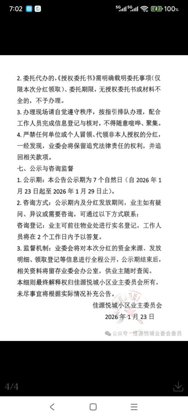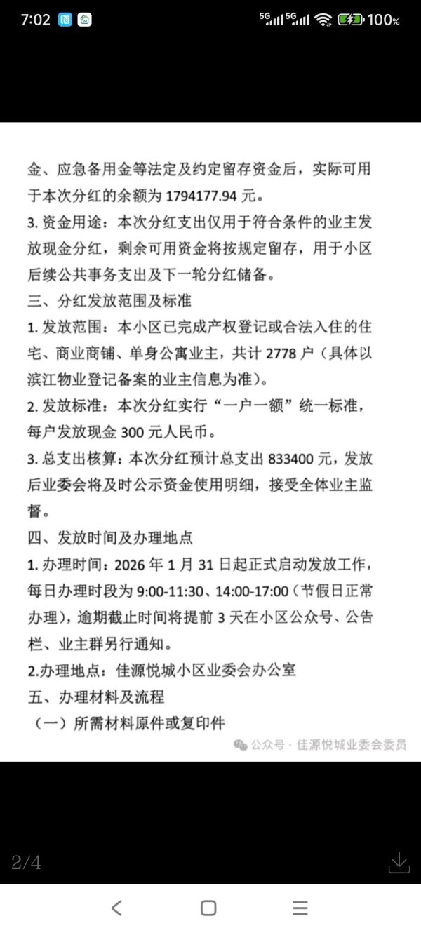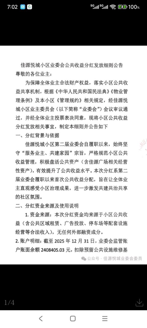 1月23日,绍兴越城区佳源悦城业委会发布一则小区分红公告,公告显示,本次分红实行“一户一额”统一标准,每户发放300元人民币。分红预计支出833400元,分红资金均来自小区公共收益,无任何外部融资成分。