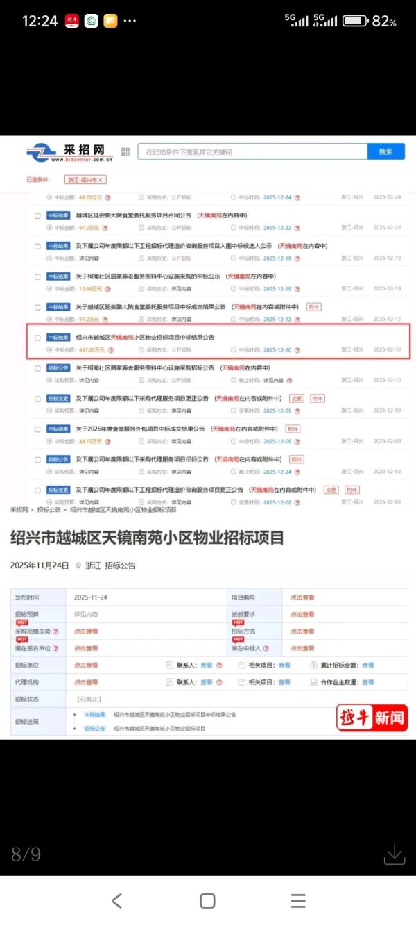记者在采招网上查询到的天镜南苑物业招标信息和招标结果公示