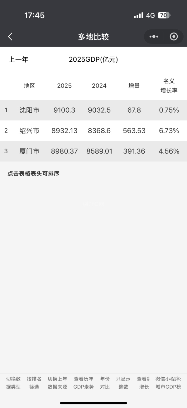9100亿,增量不到70亿,以汽车为支柱的二产受重创,靠着三产和省会的地位勉强撑住。绍兴大幅追近,虽遗憾未能超越对手,但基本追上。期待保持势头,今年有机会实现对沈厦的双超。大家多在绍兴消费,多坐地铁,买汽车、买房子也划算啦,要早日击败对手!