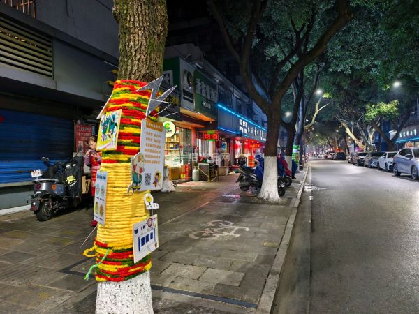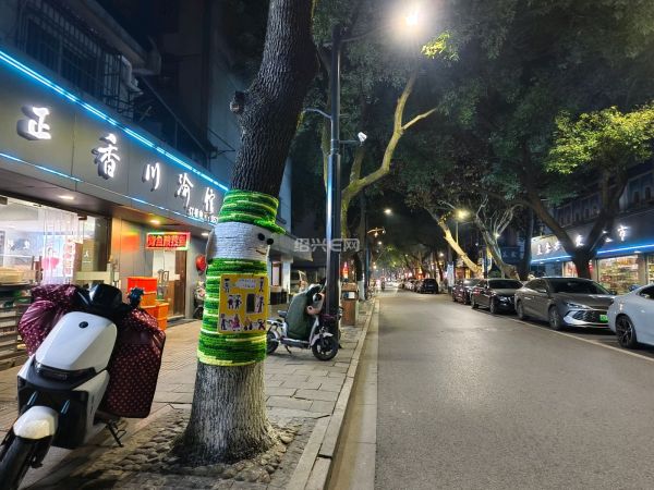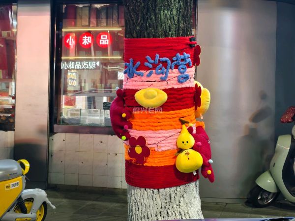 近日,绍兴越城区水沟营老街的行道树悄然披上了色彩斑斓的“毛衣”,红、黄、橙、绿的毛线交织缠绕,在夜色中点亮了整条街巷。