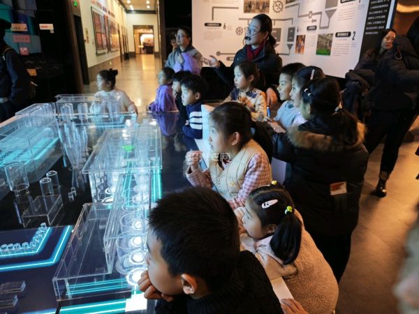 在酿造工艺展区,手工酿酒与现代科技酿酒的对比展示引发了孩子们的浓厚兴趣。他们认真聆听讲解员介绍:手工黄酒采用陶缸冬酿,经八十余天自然发酵,依赖酿酒师傅的精湛手艺;而现代科技则以不锈钢大罐酿造,通过精准控温缩短周期、提升产量。触摸着模拟酿酒工具,孩子们直观感受到了传统技艺的坚守与科技进步的力量。