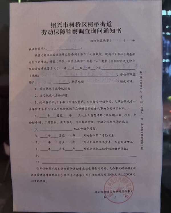 店门口贴了柯桥街道劳动保障监察调查询问通知书