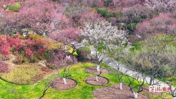 记者在现场看到,目前宫粉梅与红梅开得最为旺盛,层层叠叠的花朵压满枝头,远观如团团柔软的云霞,近赏则娇艳动人。绿萼梅也有部分植株悄然绽放,玉瘦珠光,清新脱俗,别具一格。而朱砂梅与墨梅仍以花苞为主,静待春风,蓄势待发。