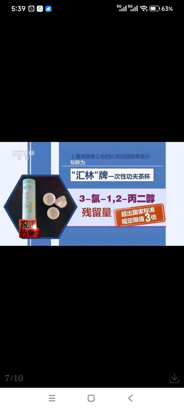 上海消保委公布的比较试验结果显示,标称为汇林牌一次性功夫茶杯,3-氯-1,2-丙二醇残留量超出国家标准规定限值的3倍。