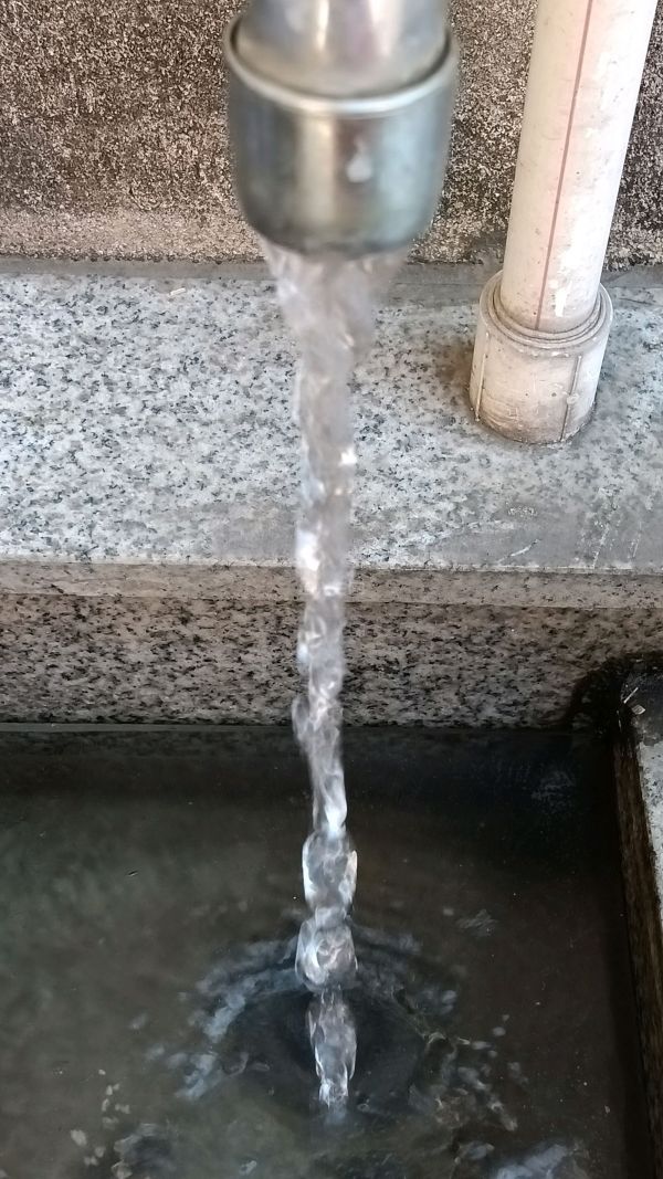 今早有冰冻,中午用水时,发现屋外的水池结冰了。