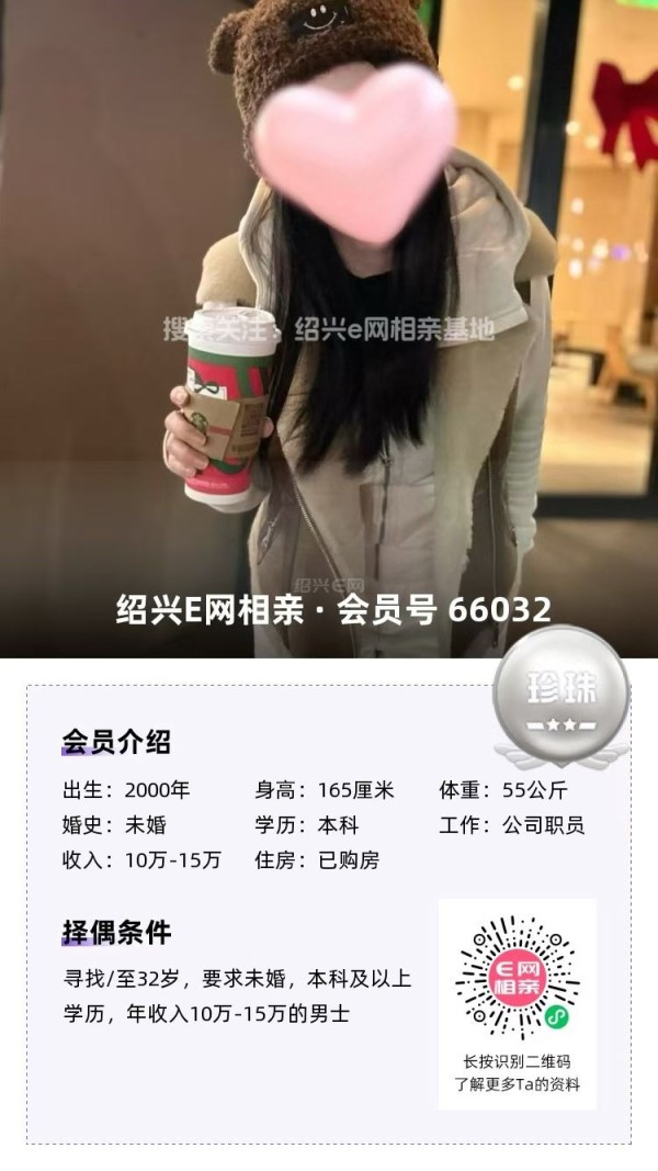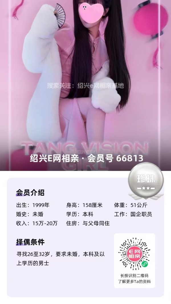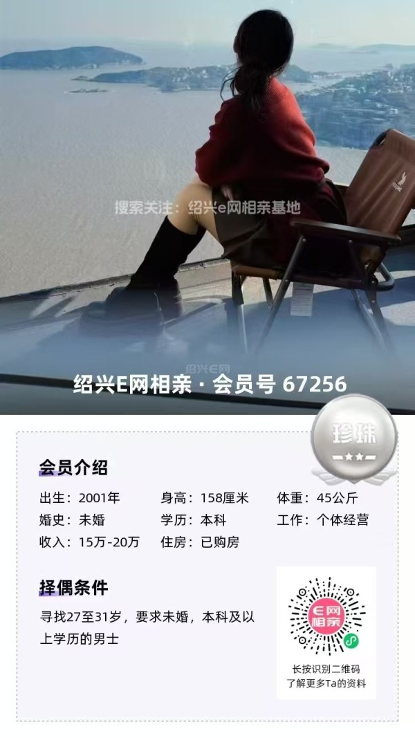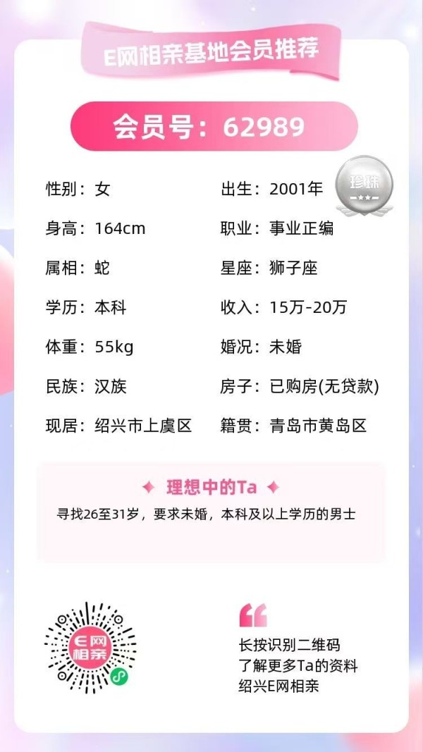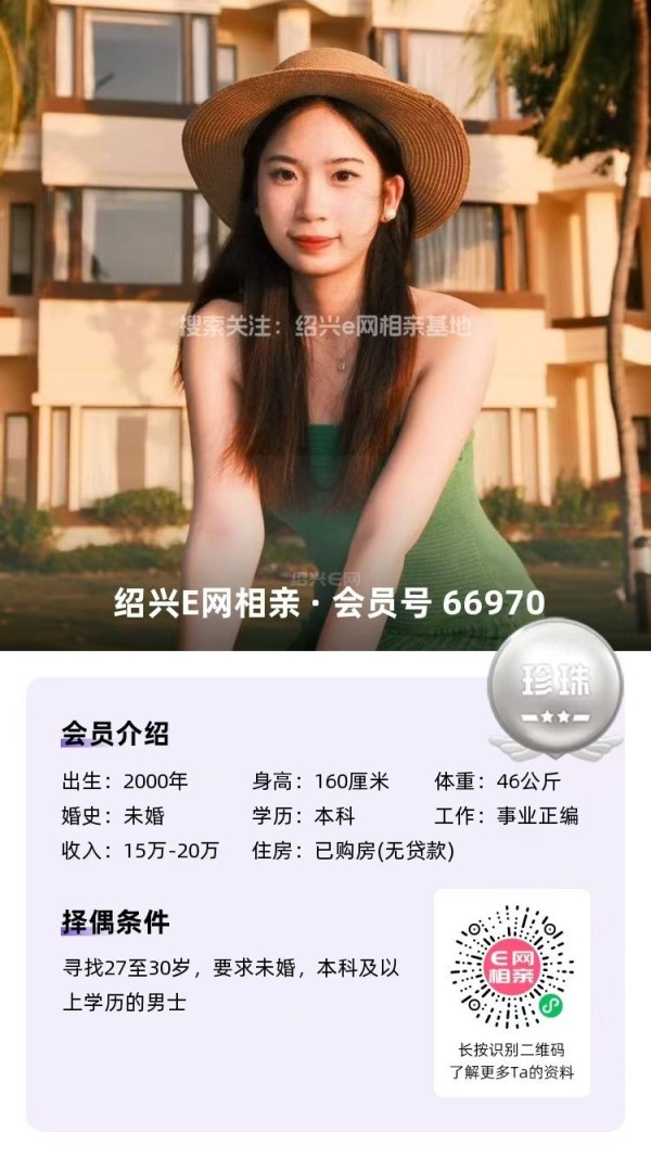 00年妹妹/事业正编老师本科/身高160越城区人嵊州工作年薪15-20万名下房车俱备无贷款家里父母+姐姐(已婚定居杭州)本人素颜就很好看哦,性格偏文静,熟悉了也是那种大方爽朗,玩得开的人。兴趣广泛,富有爱心,三观正,脾气好。寻觅:30岁以内,性格独立,三观正,彼此沟通顺畅的男生。中意可私信小胡姐介绍+66970