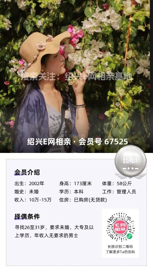 02年女生/自家工厂上班柯桥人本科/身高173年薪10-15自己家里工作学管理名下房车俱备无贷款长得活泼灵动,是个单纯可爱的姑娘。喜欢自驾游,美食,摄影和厨艺钟意可私信小胡姐介绍+67525