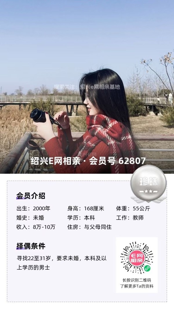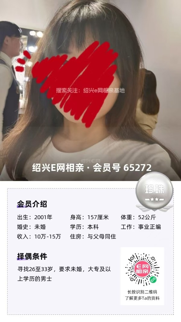 活泼可爱/真诚务实滴女生01年生/事业正编上虞人越城区工作外貌清纯可人年薪10-15万有车性格开朗独立,爱好美食和户外。寻觅:32岁以下,身高170+,大专以上,五官端正,房车俱备的绍兴本地男生中意可私信小胡姐介绍+65272