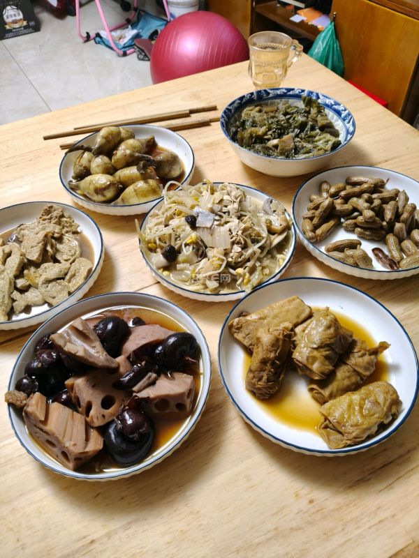 我在网上查了一下,说绍兴人请菩萨的传统八宝菜(也叫如意菜) 标准八样净素食材是:1.腌菜(咸菜/缸腌菜);2.冬笋;3.香菇;4.黑木耳;5.黄花菜(金针菜);6.千张;7.油豆腐;8.黄豆板(黄豆芽)。各家可以略有调整(比如用香干、胡萝卜替代其中一两样等等),但都要求全素无荤油、无酒,以表虔诚。这当中腌菜与笋、黄豆芽是常见不可少的灵魂原料 。