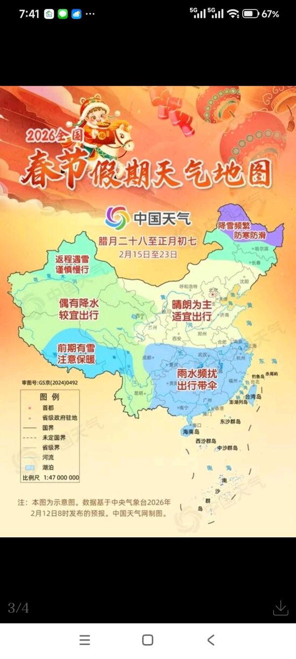 假期前半段(15日-17日):一股实力不俗的冷空气将“猛冲”而至,带来一次明显的降温、降雨和大风过程。其中,15日和16日降雨较为集中。需要特别提醒的是,降雨期间道路湿滑、能见度下降,极易引发交通拥堵和事故,请出行人员务必注意安全,相关部门也需加强管理,全力保障春运畅通。值得庆幸的是,此次过程不会出现降雪和冰冻天气。