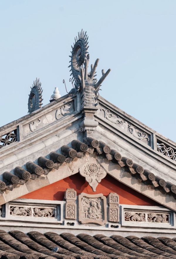 屋顶样式:单檐歇山顶,正脊背两端置龙吻,中设五色宝瓶,造型古朴典雅。