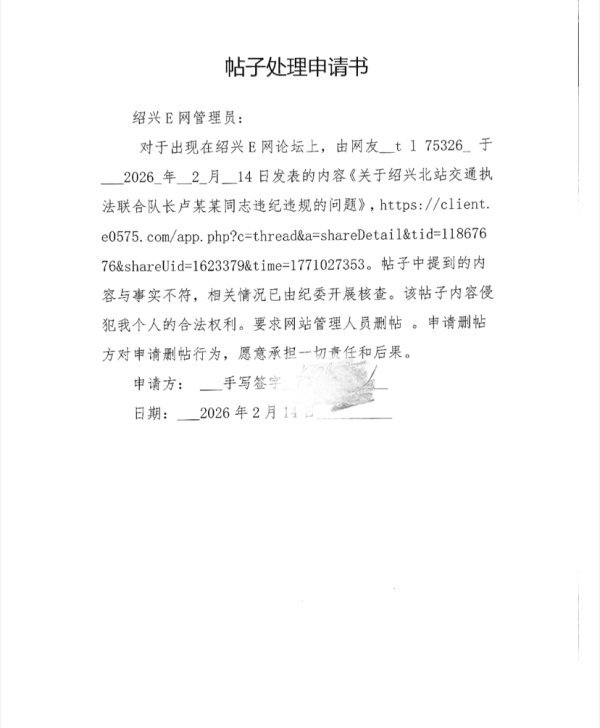 Re:《关于绍兴北站交通执法联合队长卢某某同志违纪违规的问题 》删帖说 ..